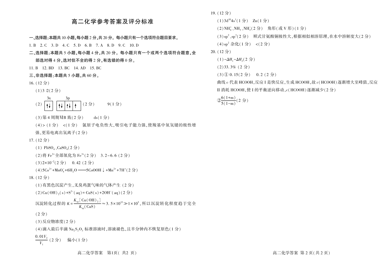 山东省潍坊市2024-2025学年上学期1月高二期末统一考试化学答案
