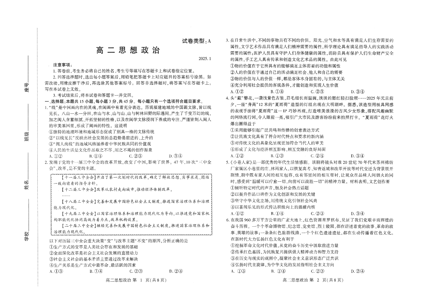山东省潍坊市2024-2025学年上学期1月高二期末统一考试政治