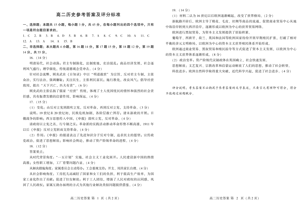 山东省潍坊市2024-2025学年上学期1月高二期末统一考试历史答案