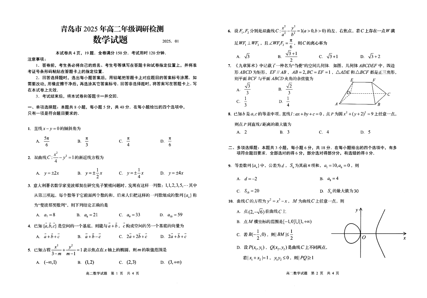 山东省青岛市2024-2025学年上学期1月高二期末统一调研检测数学