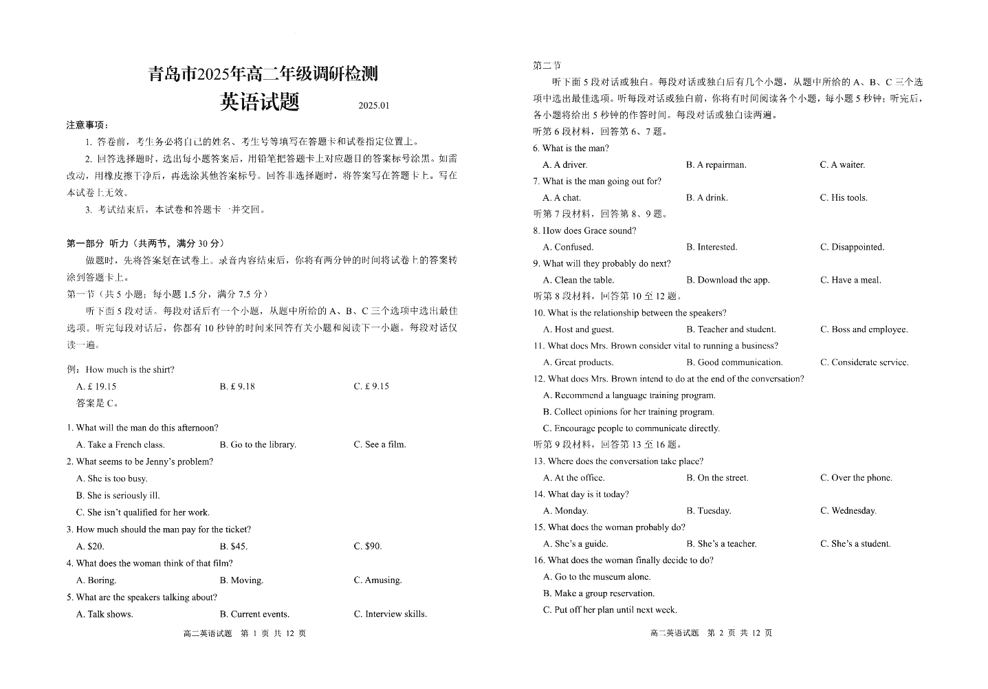 山东省青岛市2024-2025学年上学期1月高二期末统一调研检测英语