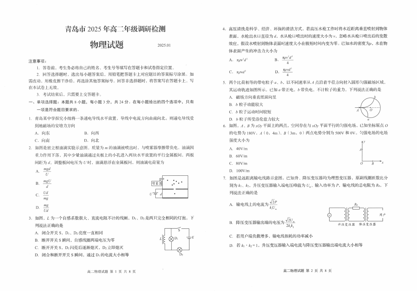 山东省青岛市2024-2025学年上学期1月高二期末统一调研检测物理