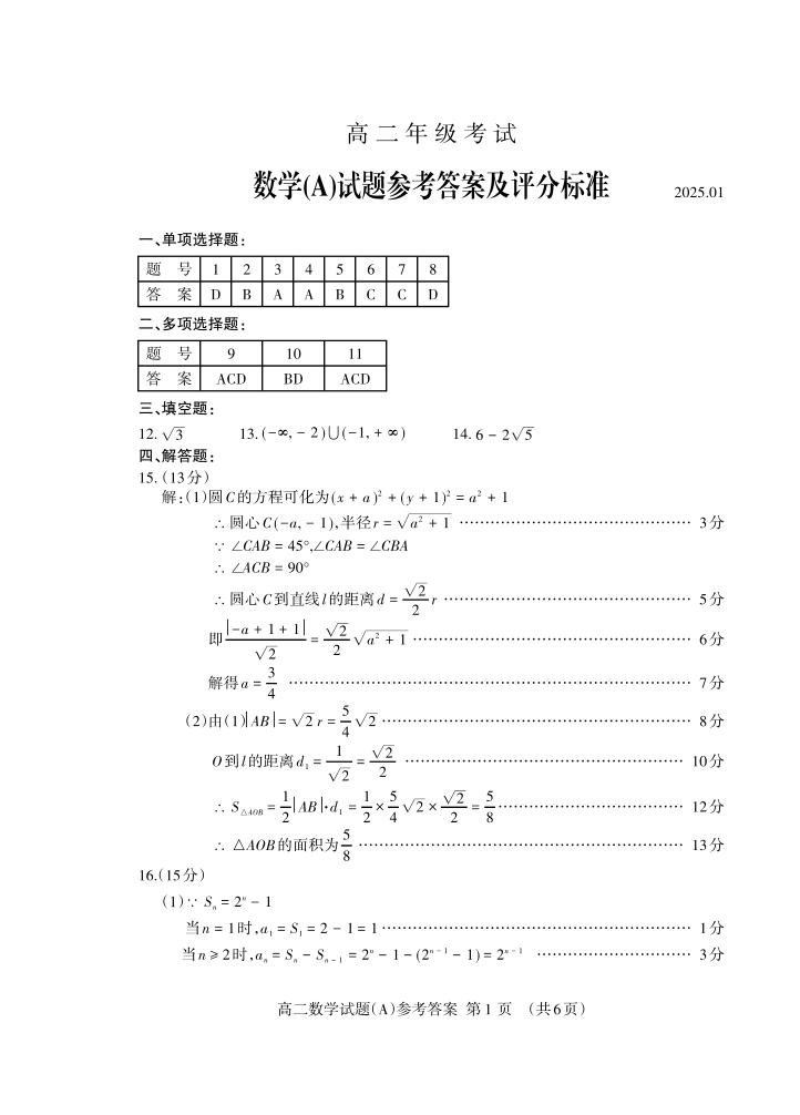 山东省泰安市2024-2025学年上学期1月高二期末统一考试数学A答案