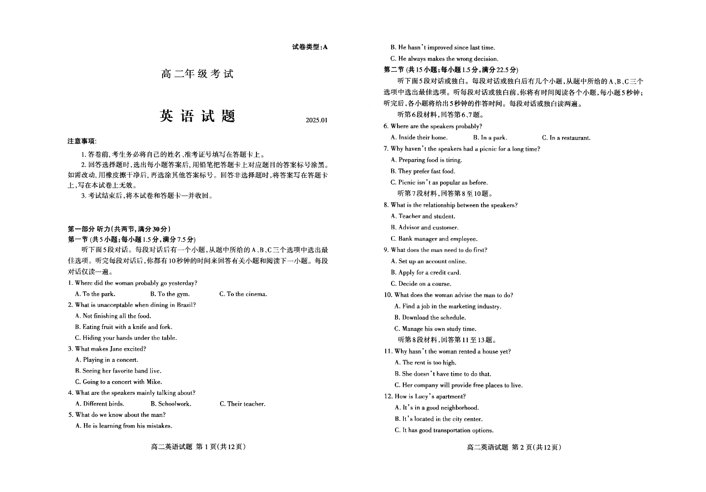 山东省泰安市2024-2025学年上学期1月高二期末统一考试英语