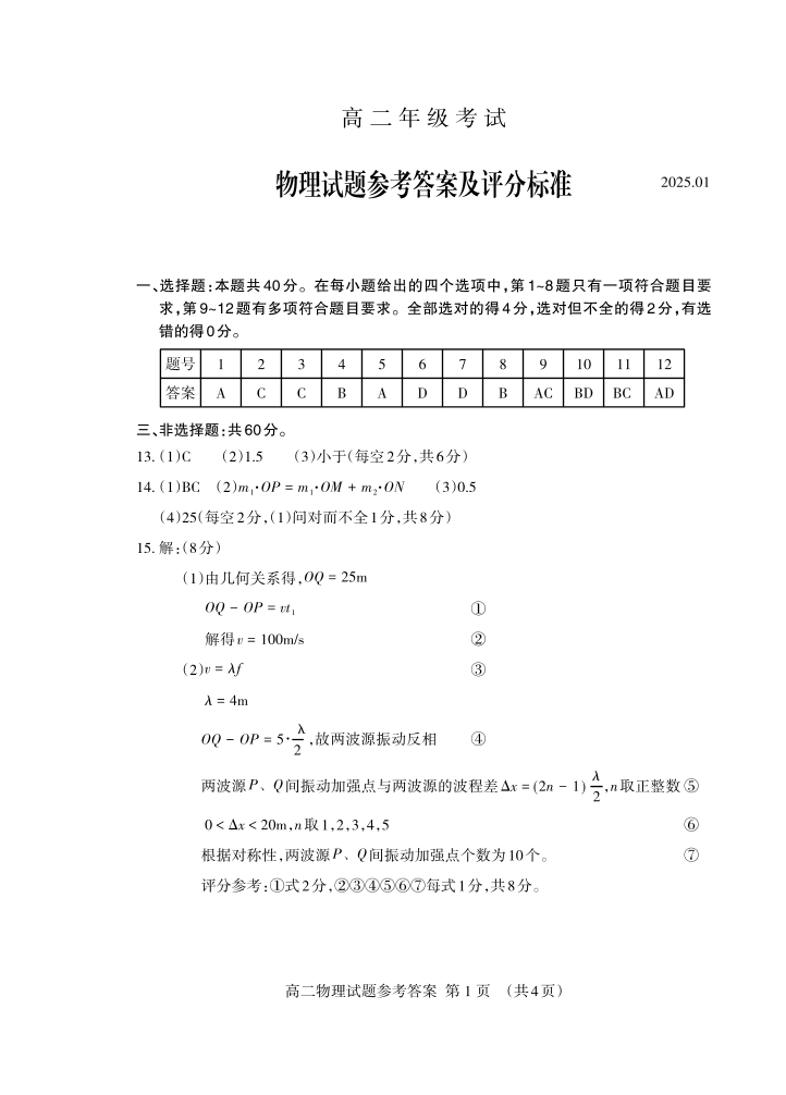 山东省泰安市2024-2025学年上学期1月高二期末统一考试物理答案