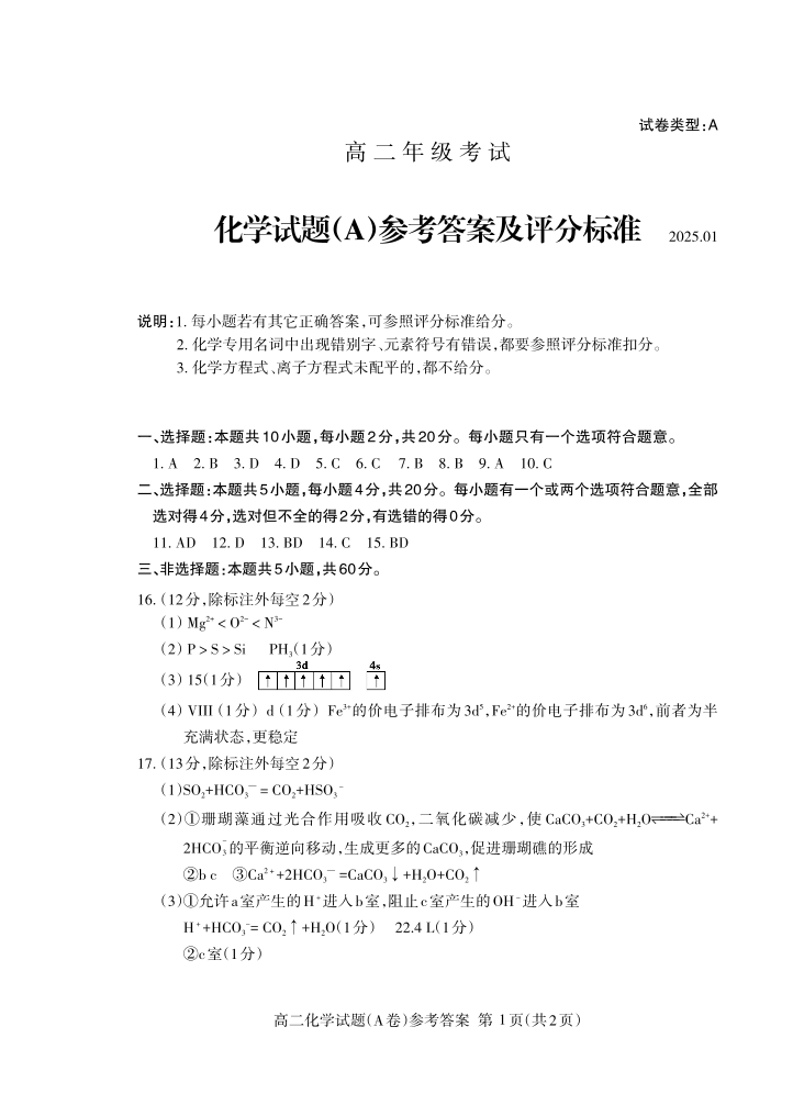山东省泰安市2024-2025学年上学期1月高二期末统一考试化学答案