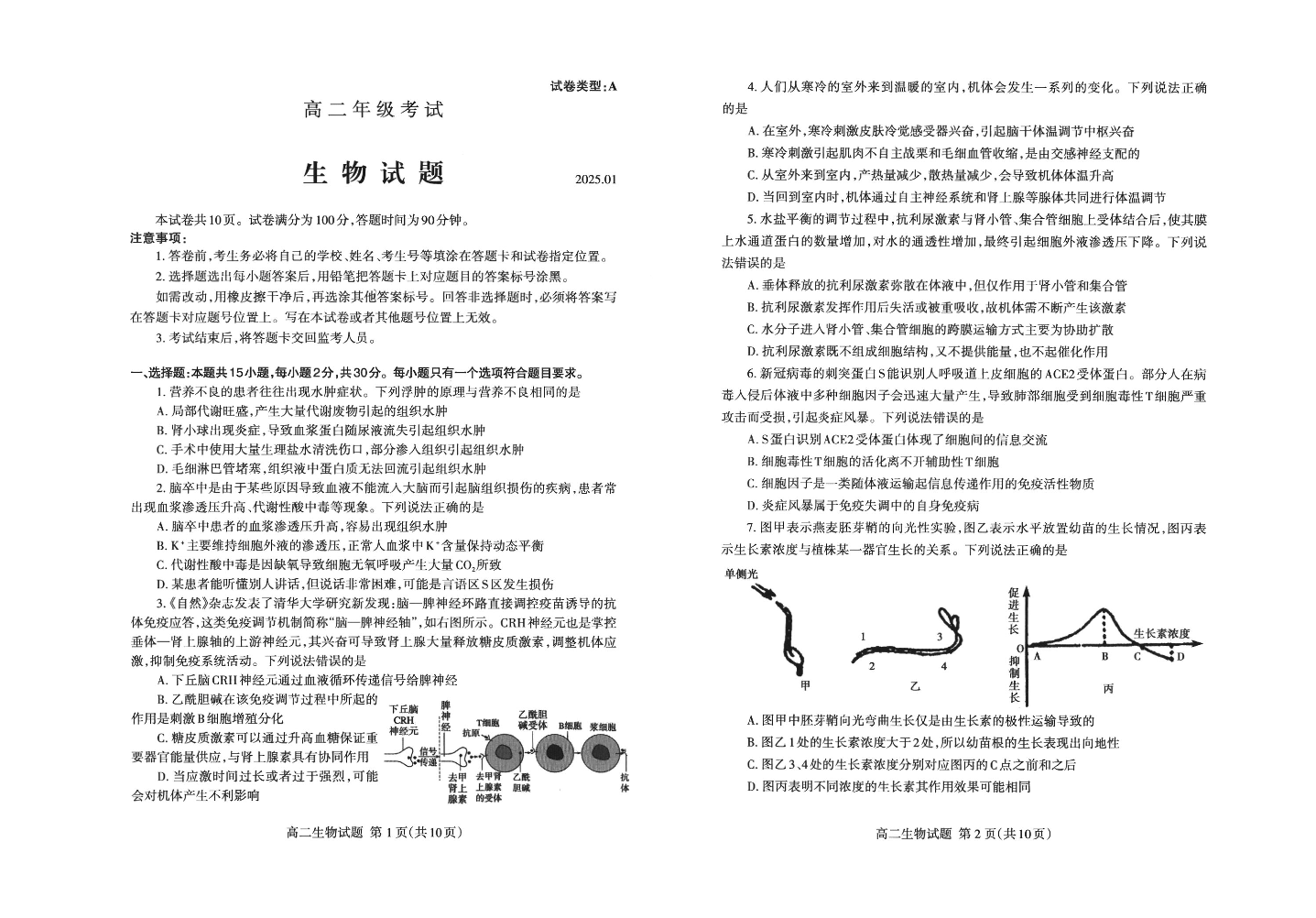 山东省泰安市2024-2025学年上学期1月高二期末统一考试生物