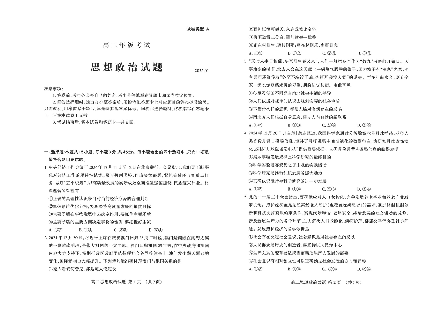 山东省泰安市2024-2025学年上学期1月高二期末统一考试政治