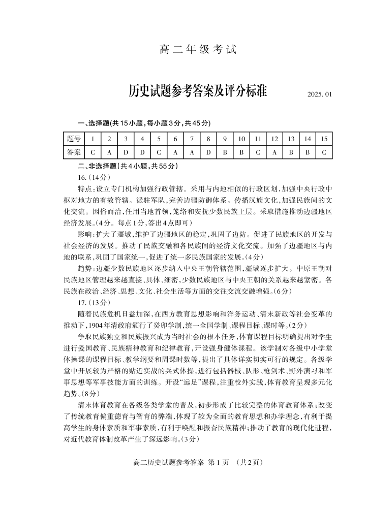 山东省泰安市2024-2025学年上学期1月高二期末统一考试历史答案