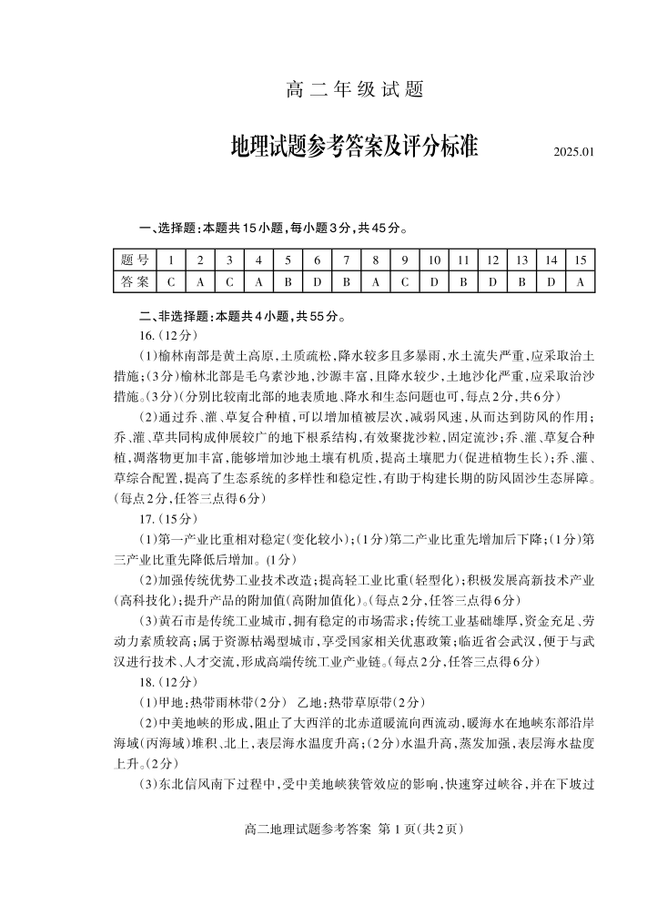 山东省泰安市2024-2025学年上学期1月高二期末统一考试地理答案