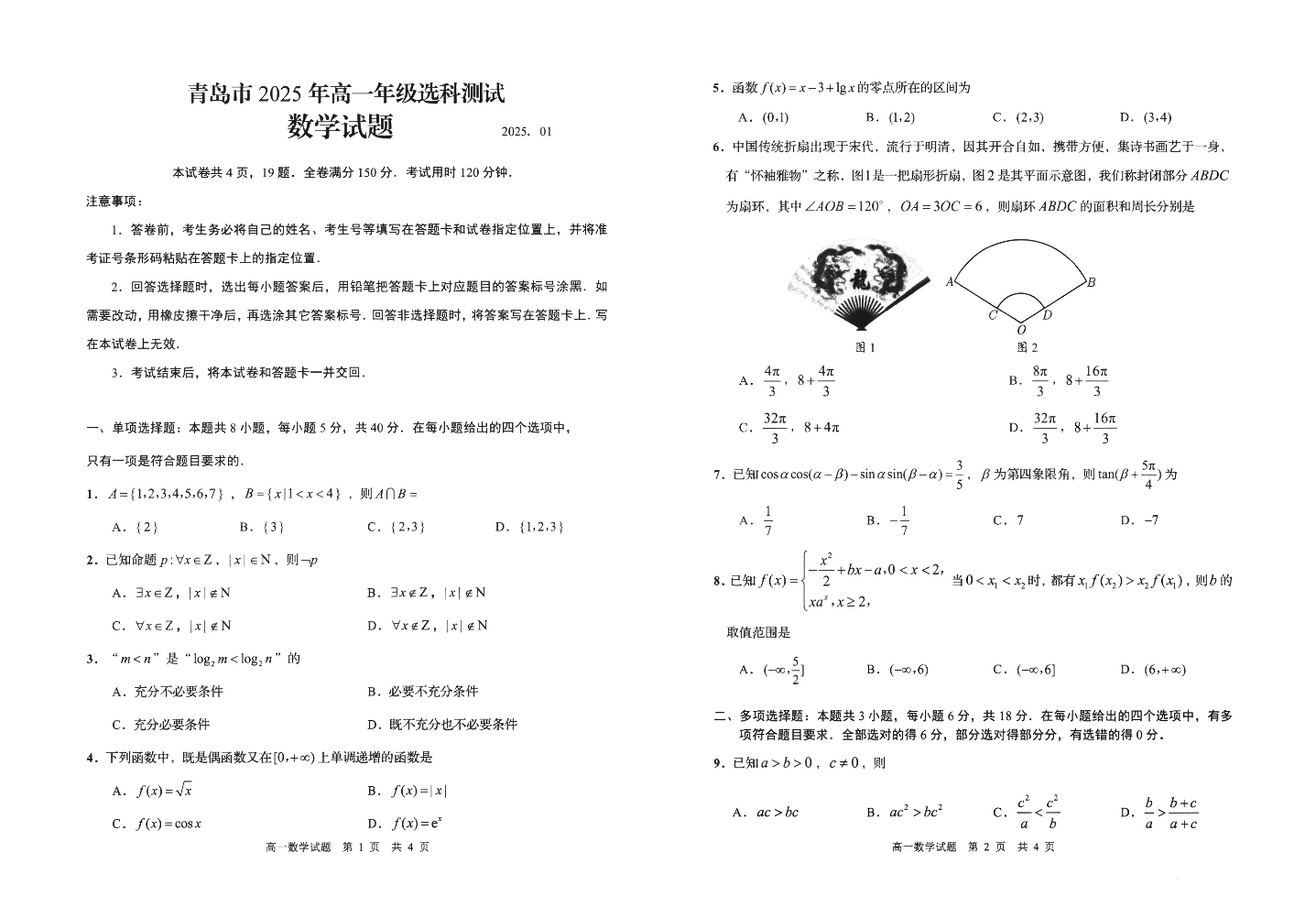 山东省青岛市2024-2025学年上学期1月高一期末统一选科测试数学