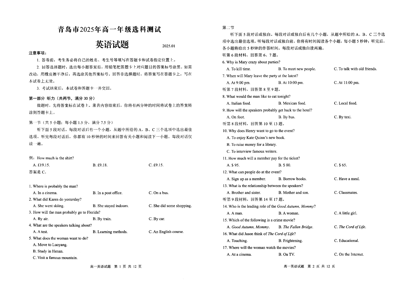山东省青岛市2024-2025学年上学期1月高一期末统一选科测试英语