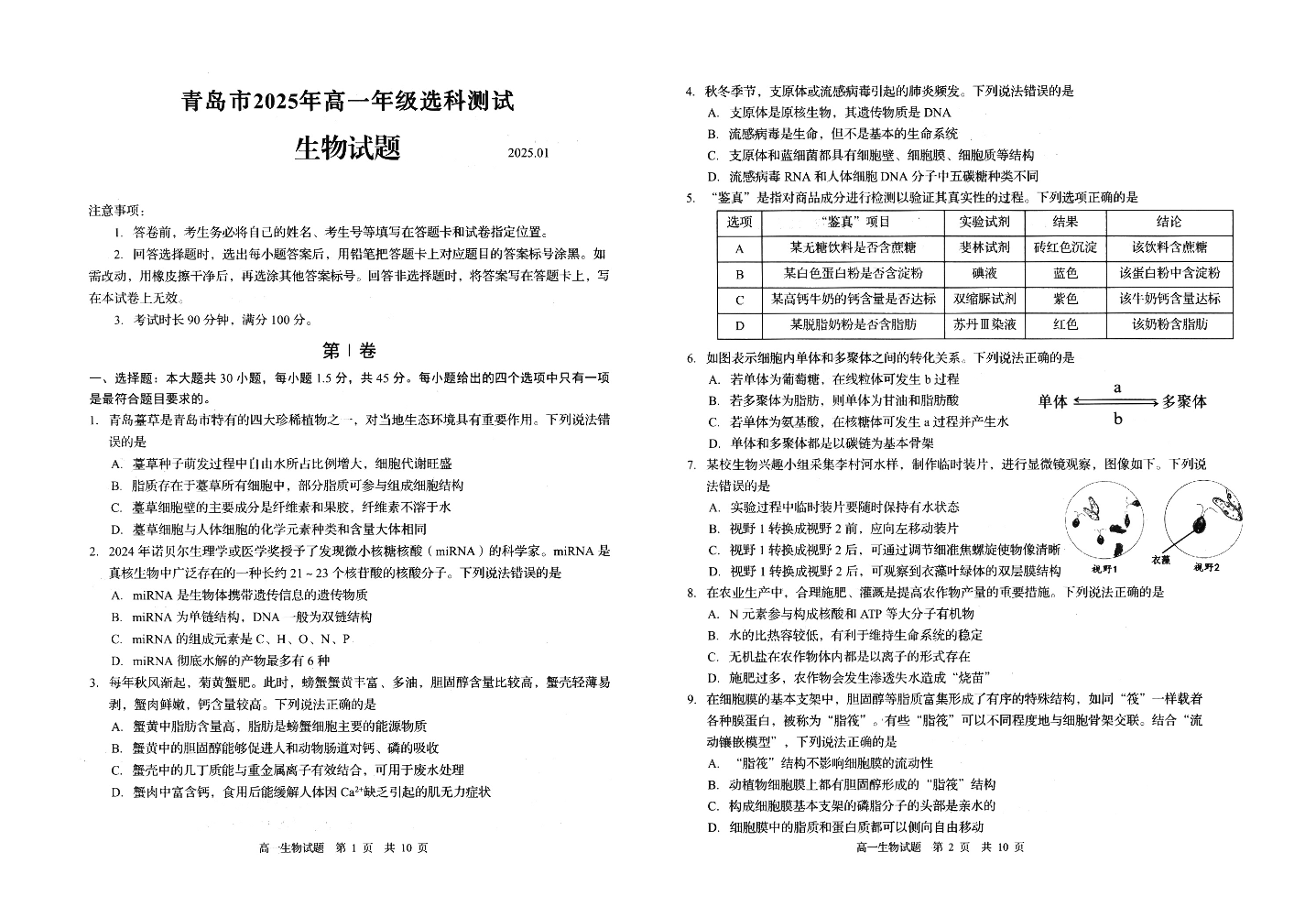 山东省青岛市2024-2025学年上学期1月高一期末统一选科测试生物