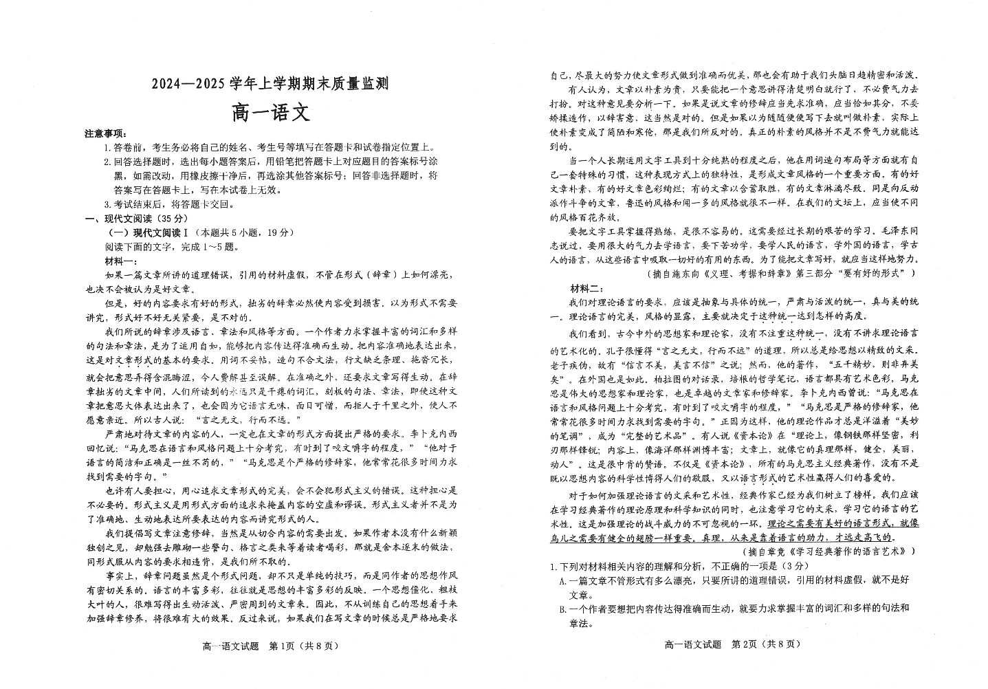 山东省潍坊市区域2024-2025学年上学期1月高一期末质量监测语文