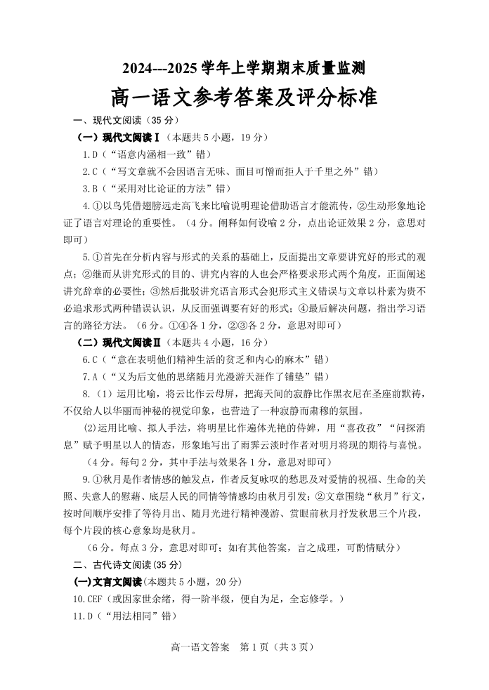 山东省潍坊市区域2024-2025学年上学期1月高一期末质量监测语文答案