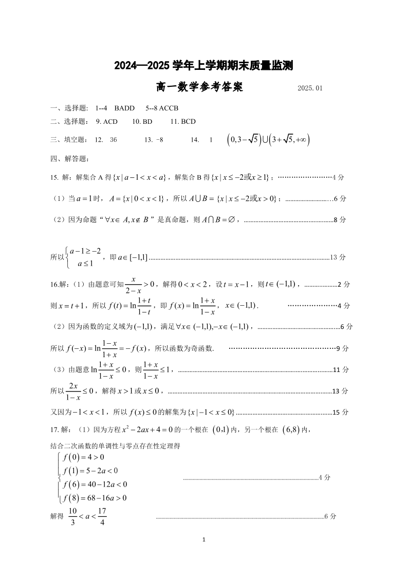 山东省潍坊市区域2024-2025学年上学期1月高一期末质量监测数学答案