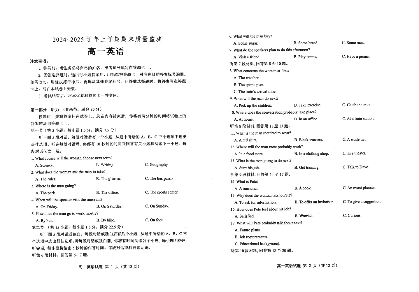 山东省潍坊市区域2024-2025学年上学期1月高一期末质量监测英语