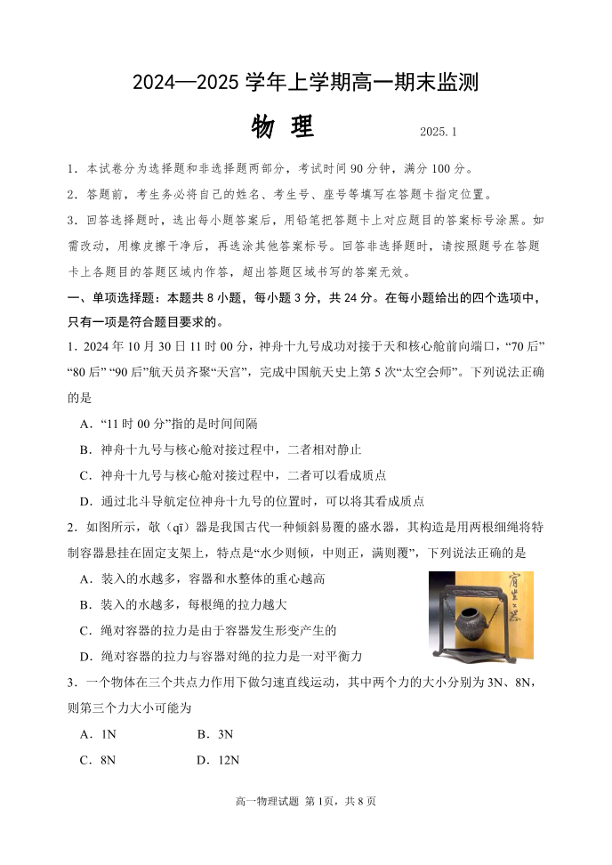 山东省潍坊市区域2024-2025学年上学期1月高一期末质量监测物理