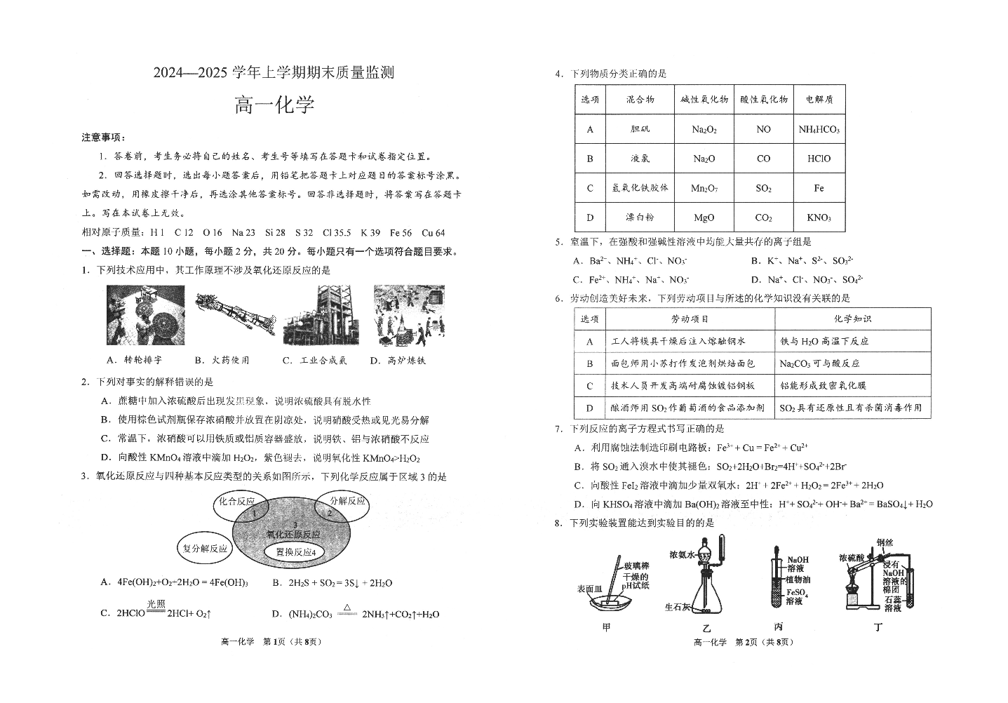 山东省潍坊市区域2024-2025学年上学期1月高一期末质量监测化学