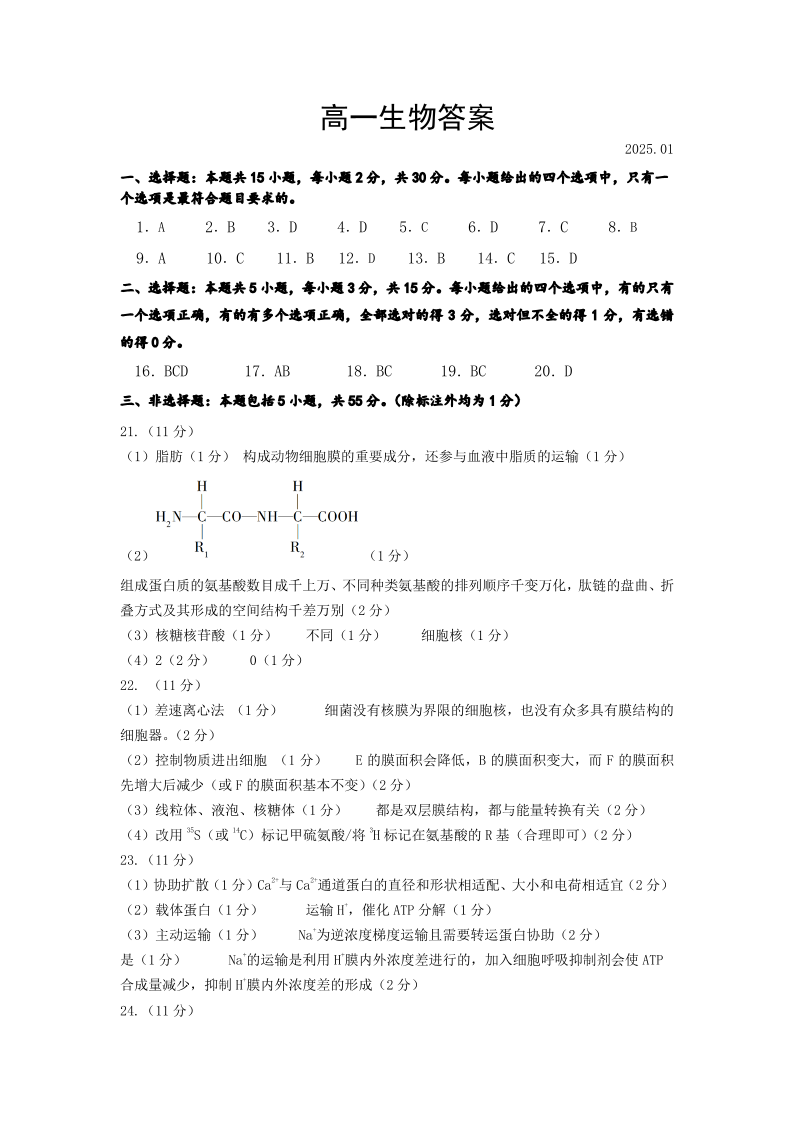 山东省潍坊市区域2024-2025学年上学期1月高一期末质量监测生物答案