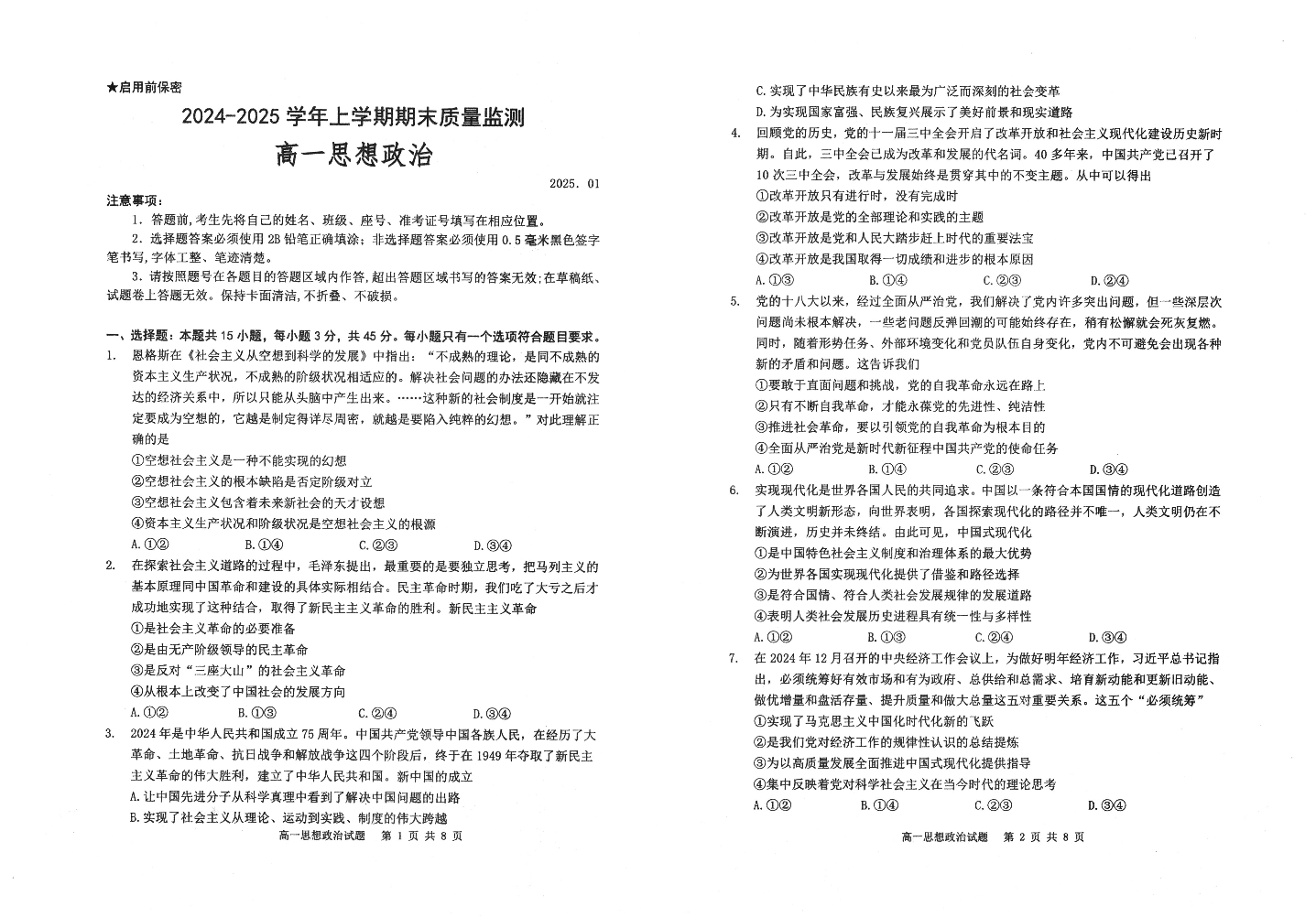山东省潍坊市区域2024-2025学年上学期1月高一期末质量监测政治