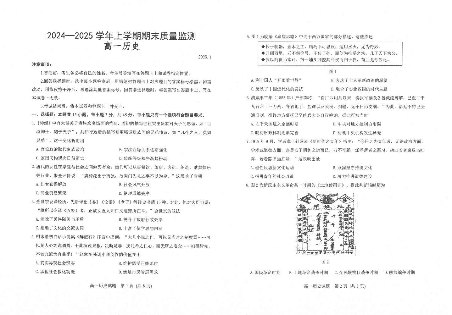 山东省潍坊市区域2024-2025学年上学期1月高一期末质量监测历史