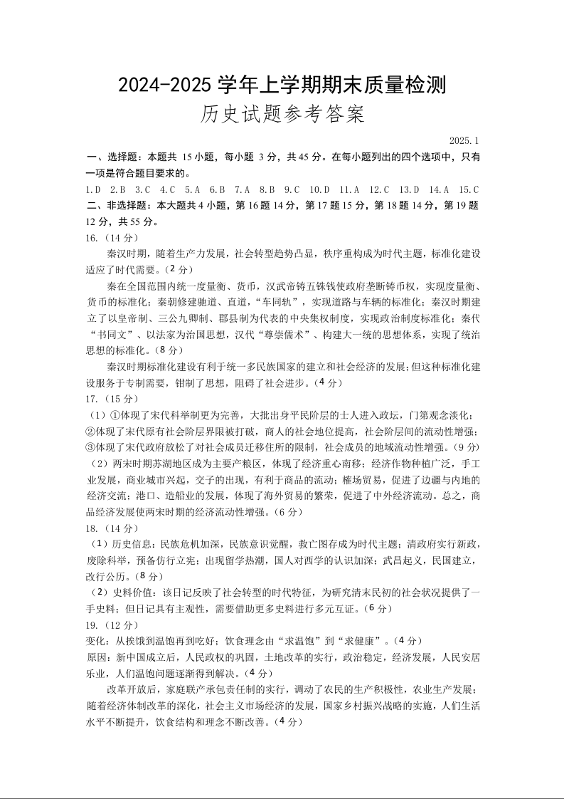 山东省潍坊市区域2024-2025学年上学期1月高一期末质量监测历史答案