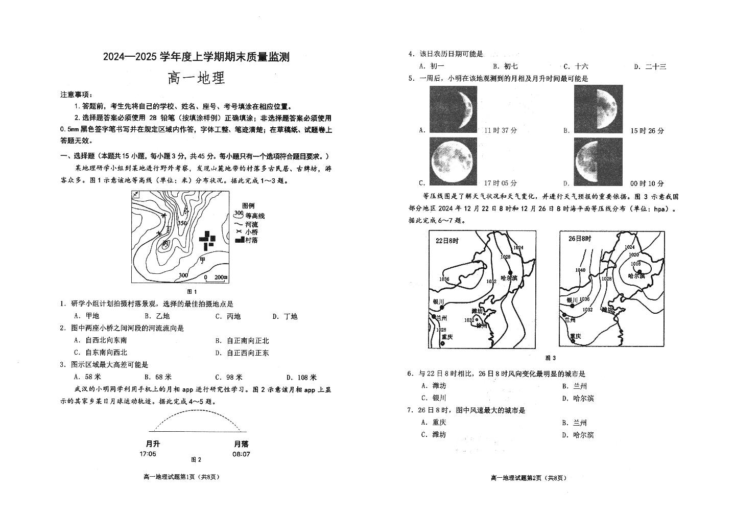山东省潍坊市区域2024-2025学年上学期1月高一期末质量监测地理