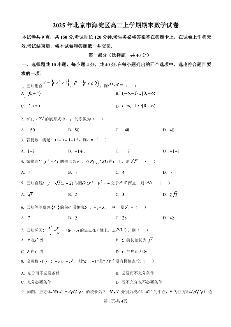 北京市海淀区2024-2025学年第一学期高三期末考试数学
