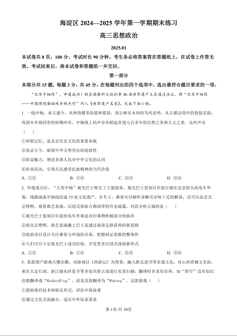 北京市海淀区2024-2025学年第一学期高三期末考试政治