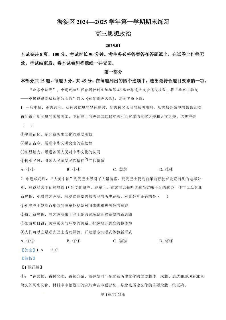 北京市海淀区2024-2025学年第一学期高三期末考试政治答案