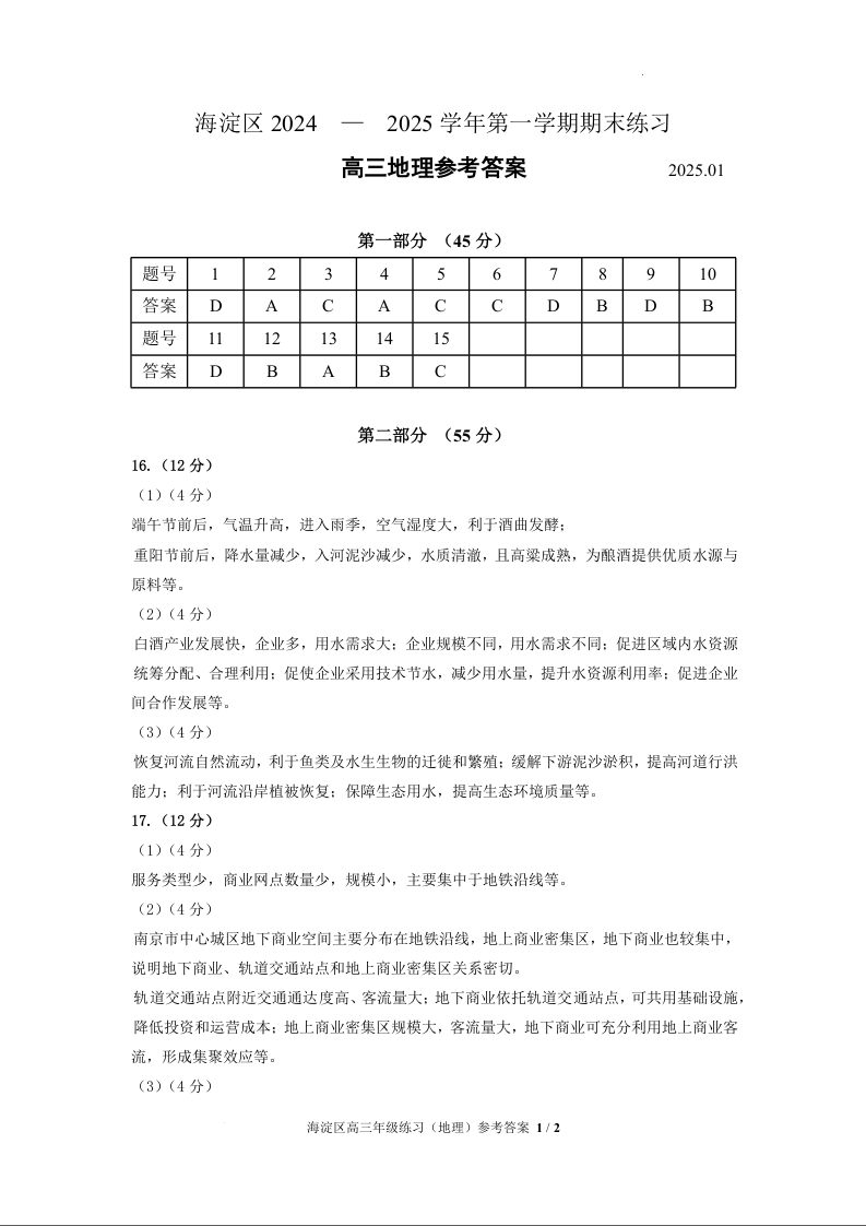 北京市海淀区2024-2025学年第一学期高三期末考试地理答案