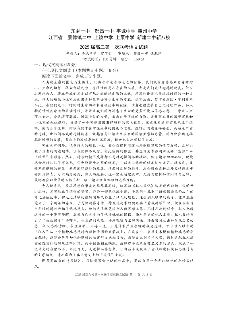 江西省新八校2025届高三第一次联考语文