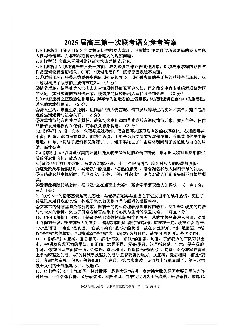 江西省新八校2025届高三第一次联考语文答案