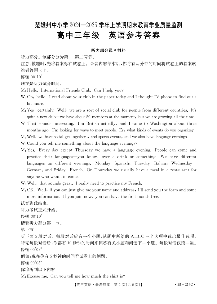 云南省楚雄州2024-2025学年上学期高三期末教育学业质量监测英语答案