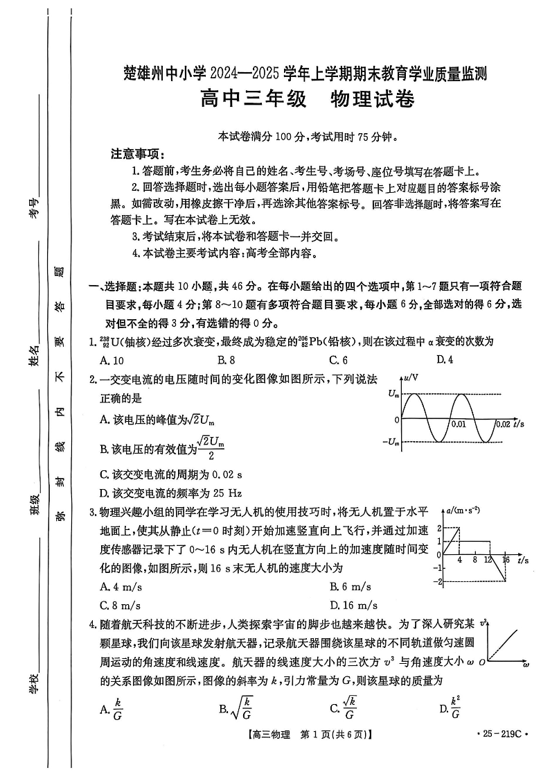 云南省楚雄州2024-2025学年上学期高三期末教育学业质量监测物理