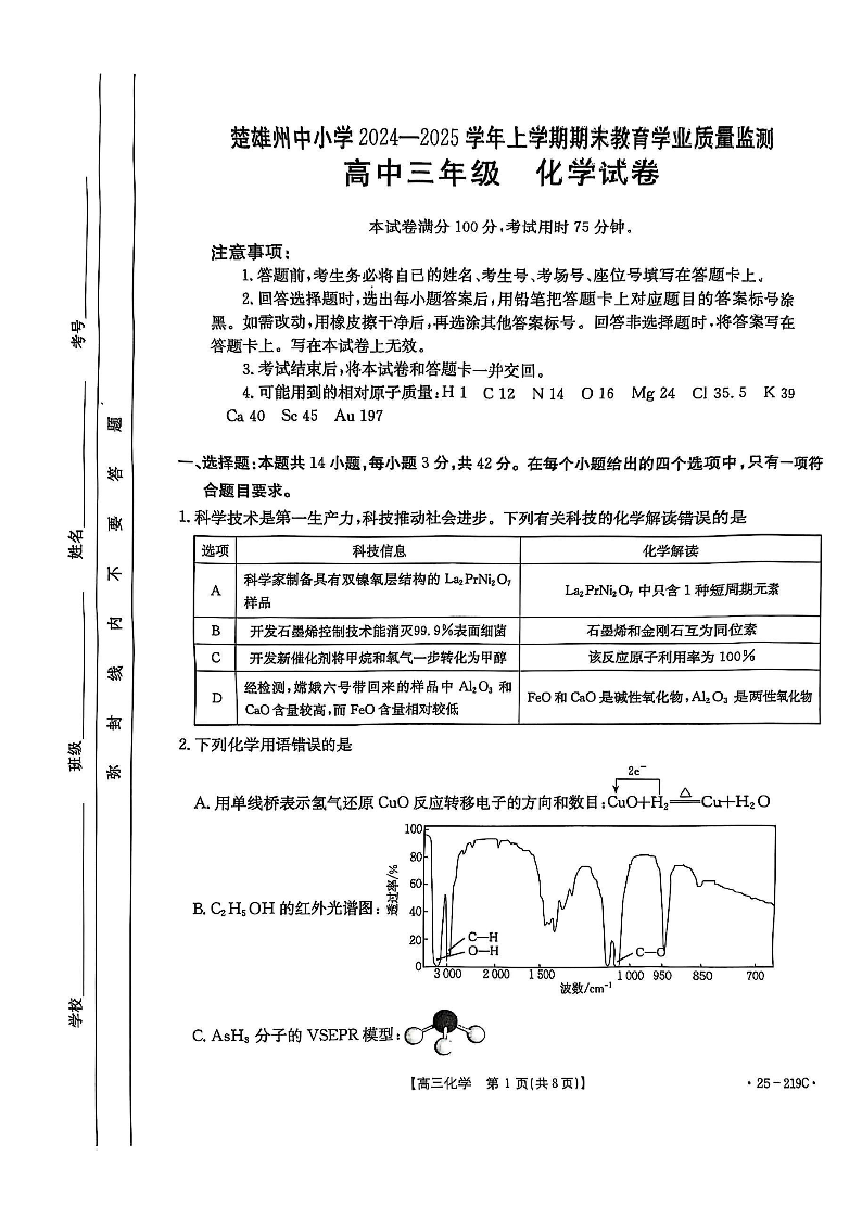 云南省楚雄州2024-2025学年上学期高三期末教育学业质量监测化学