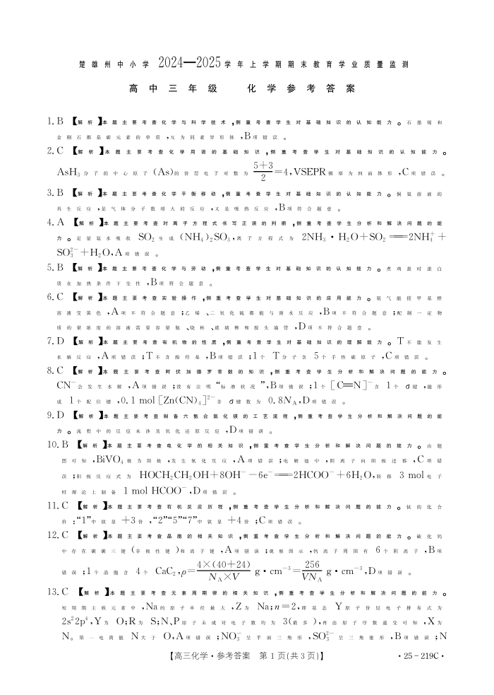 云南省楚雄州2024-2025学年上学期高三期末教育学业质量监测化学答案