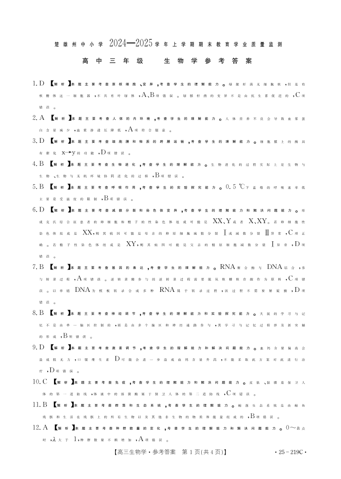 云南省楚雄州2024-2025学年上学期高三期末教育学业质量监测生物答案