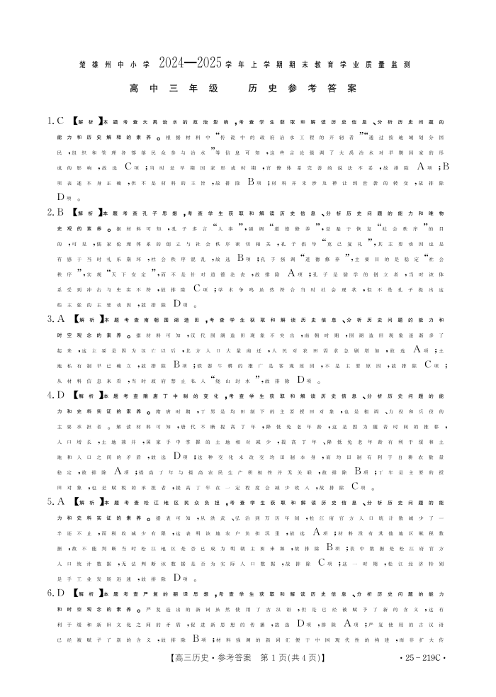 云南省楚雄州2024-2025学年上学期高三期末教育学业质量监测历史答案