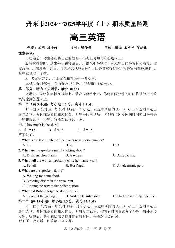 辽宁省丹东市2024-2025学年(上)高三期末教学质量监测英语