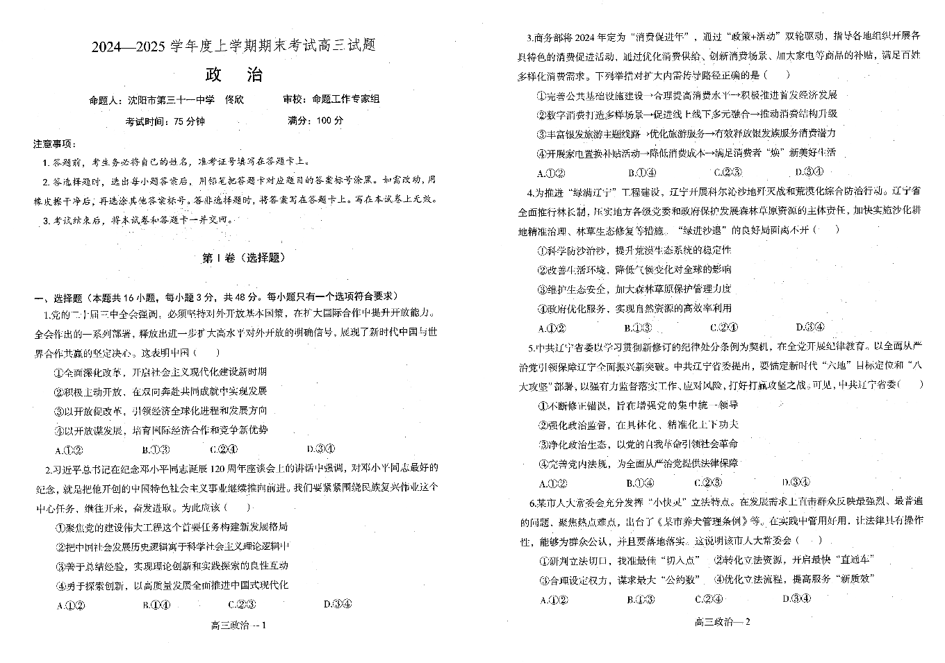 辽宁省省重点中学协作校2024-2025学年上学期高三期末考试政治