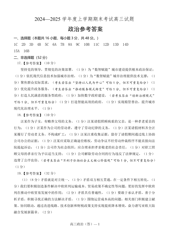 辽宁省省重点中学协作校2024-2025学年上学期高三期末考试政治答案
