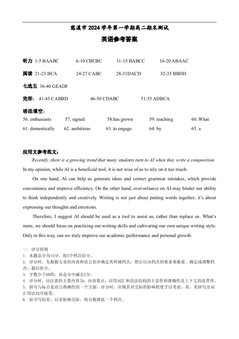 浙江省宁波慈溪市2024-2025学年高二上学期1月高二期末考试英语答案