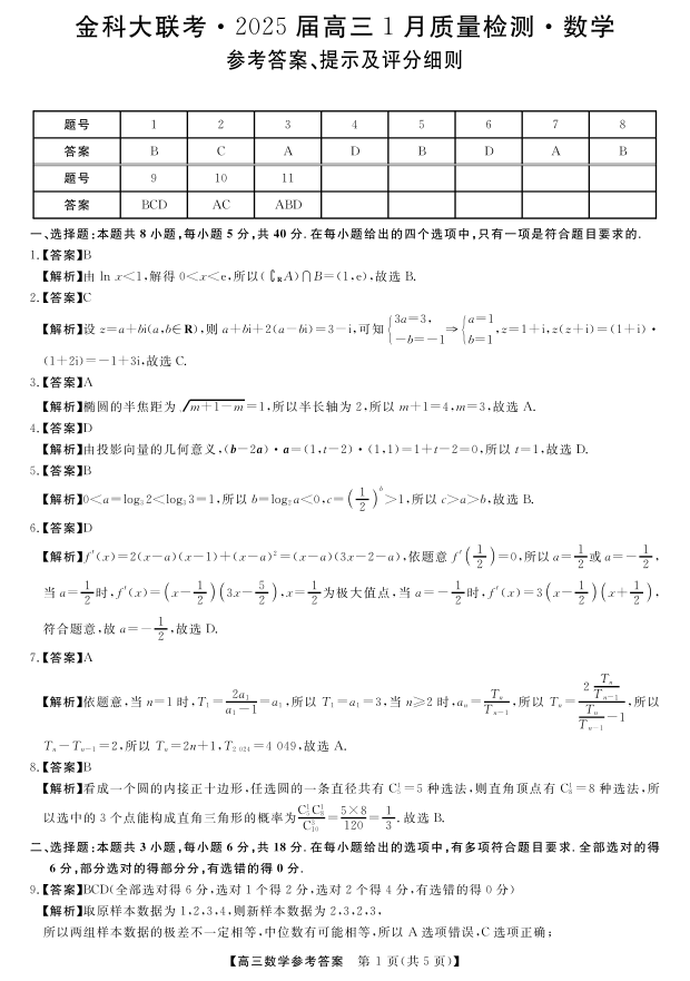 山西省金科大联考2025届1月高三质量检测数学答案