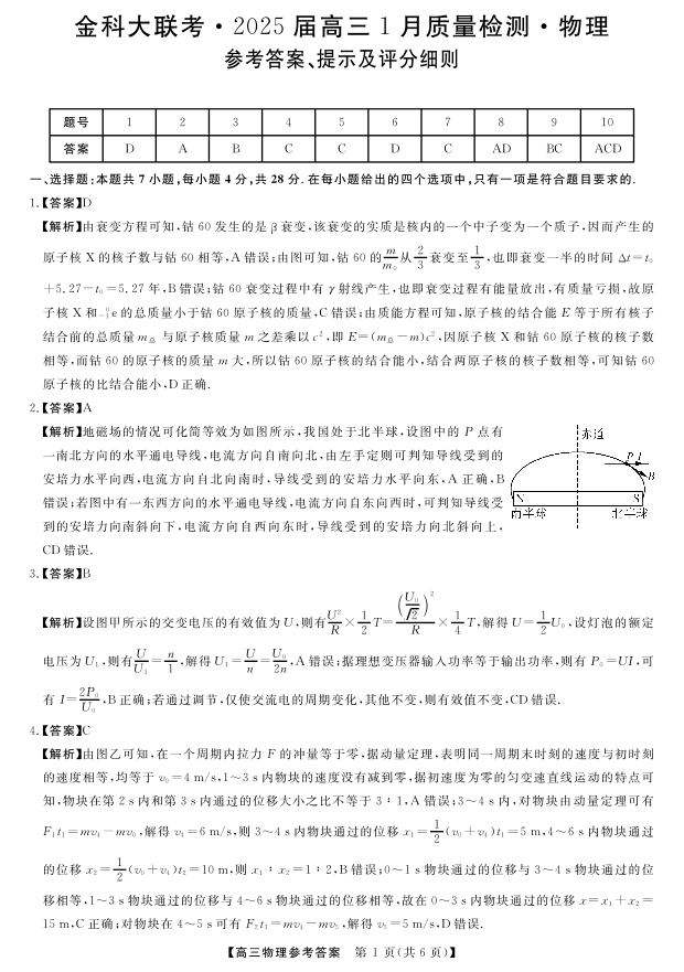 山西省金科大联考2025届1月高三质量检测物理答案