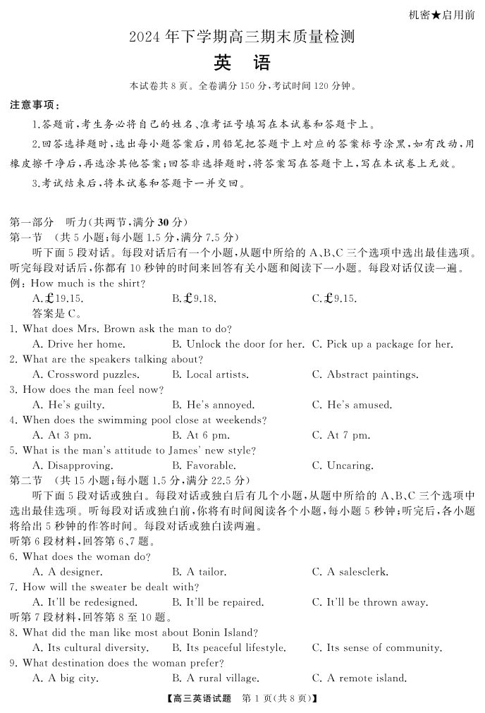 湖南五市2025届上学期1月高三期末质量检测英语