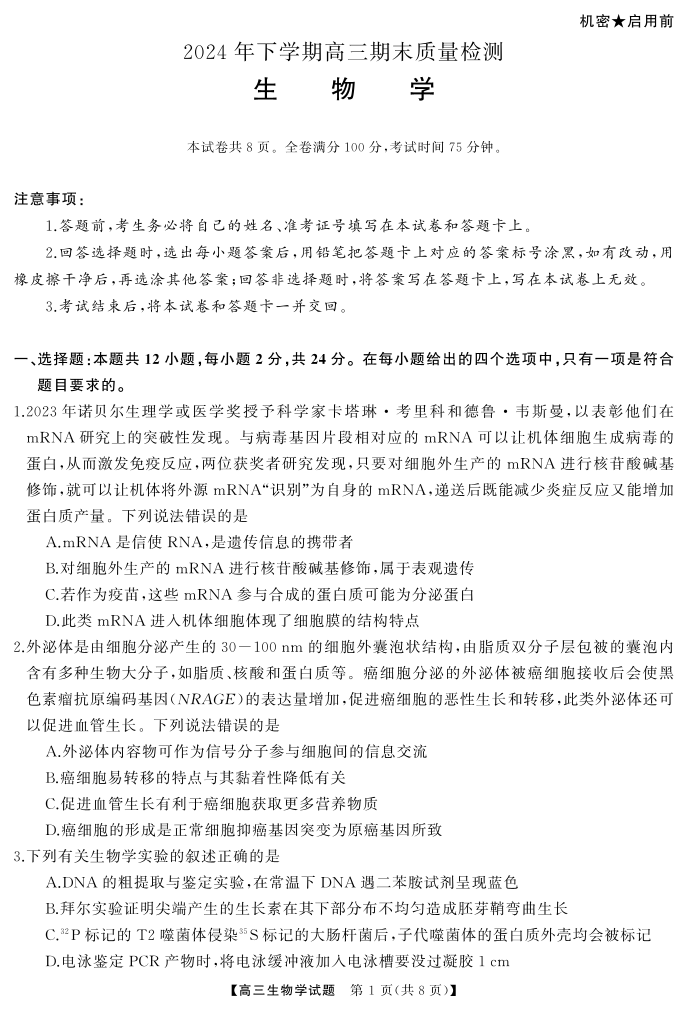 湖南五市2025届上学期1月高三期末质量检测生物