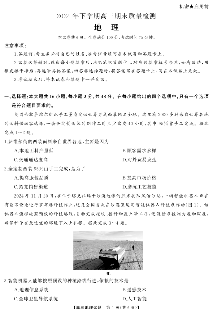 湖南五市2025届上学期1月高三期末质量检测地理