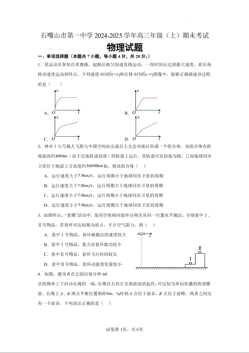 宁夏石嘴山市第一中学2025届上学期1月高三期末考试物理